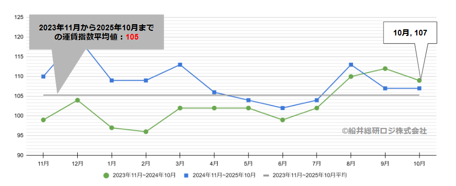 - 2025年10月のトラック運賃指数は、前月比0、前年同月比-1の107となっている