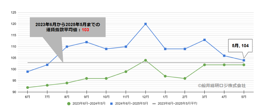 - 2025年5月のトラック運賃指数は、前月比-2、前年同月比+2の104となっている
