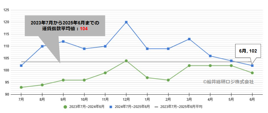 - 2025年6月のトラック運賃指数は、前月比-2、前年同月比+3の102となっている