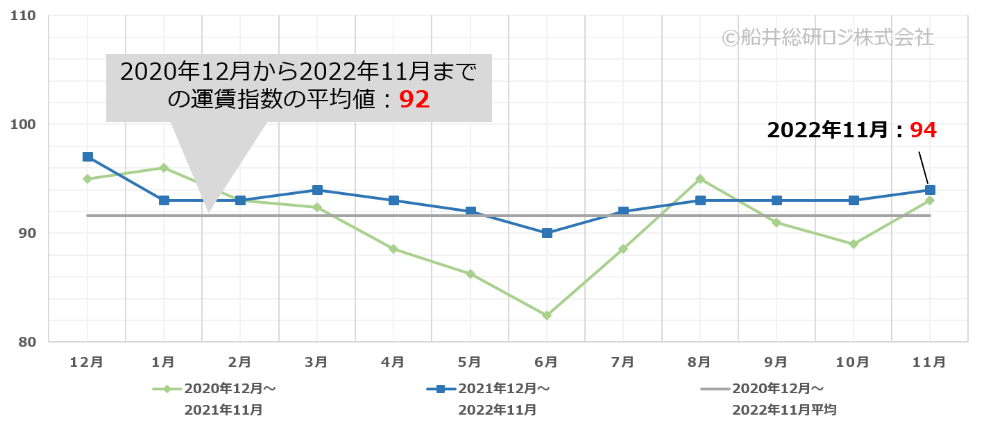 ・2022年11月のトラック運賃指数は、前月比+1、前年同月比+1の94であった