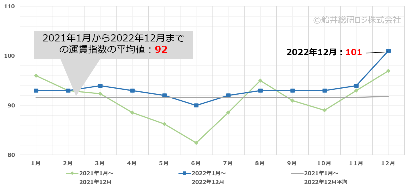 ・2022年12月のトラック運賃指数は、前月比+7、前年同月比+4の101となっており、過去2年間で最も高いトラック運賃指数となっている。