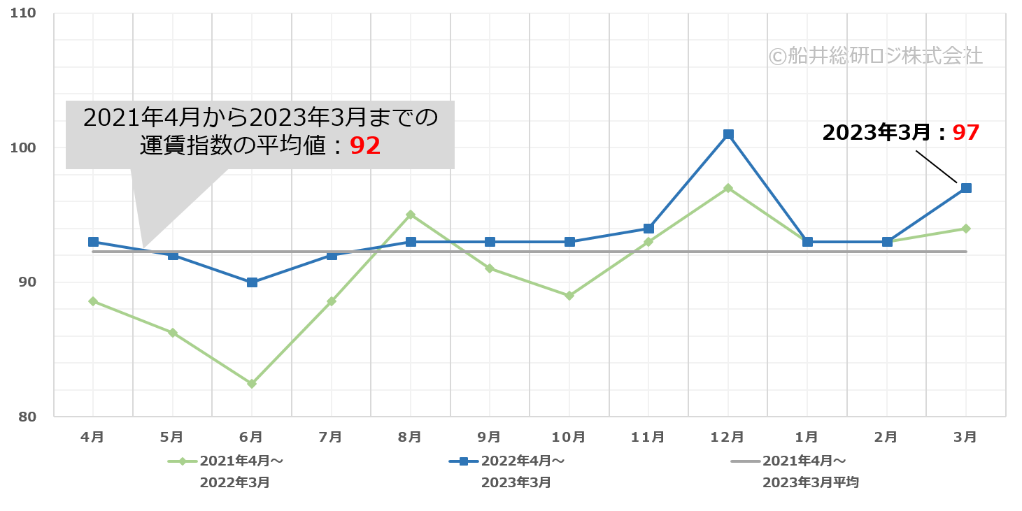 ・2023年3月のトラック運賃指数は、前月比+4、前年同月比+3の97となっている