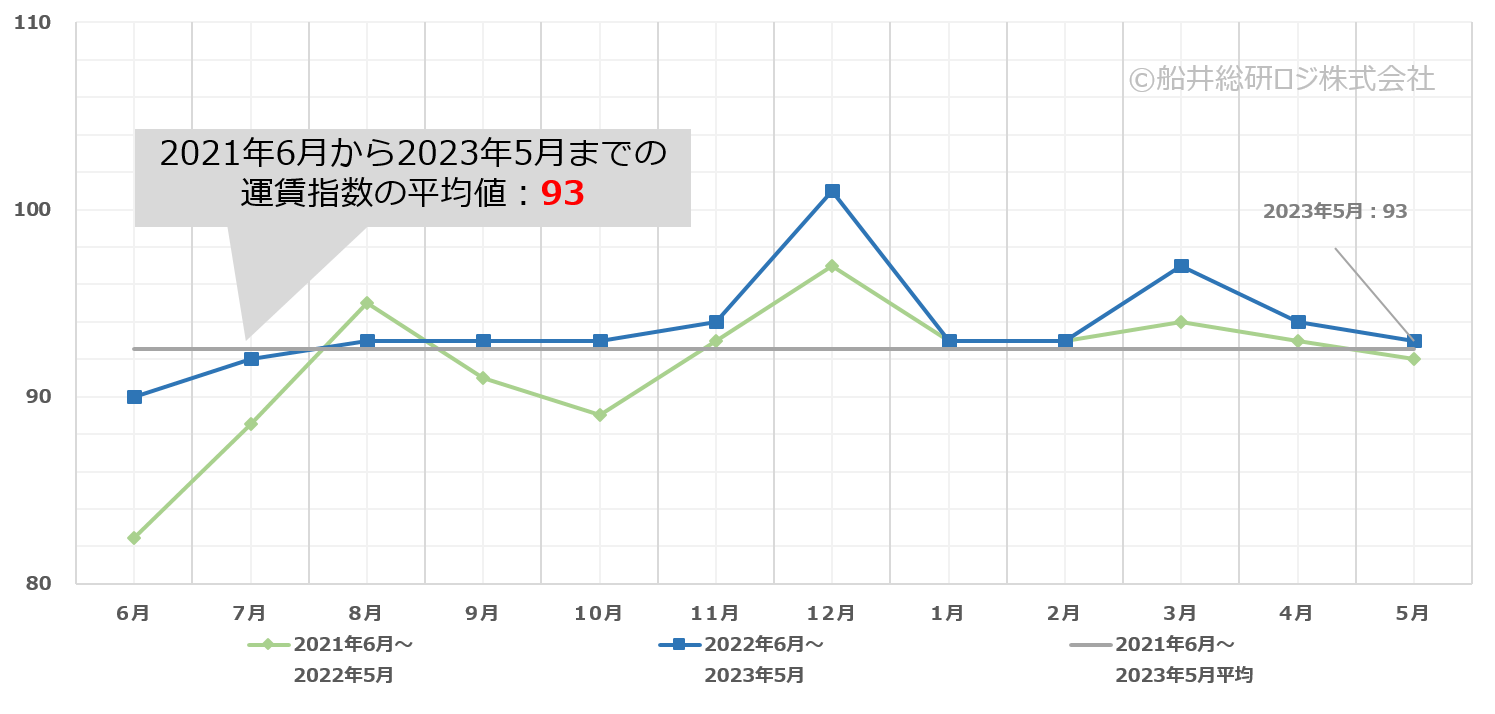 ・2023年5月のトラック運賃指数は、前月比-1、前年同月比+1の93となっている