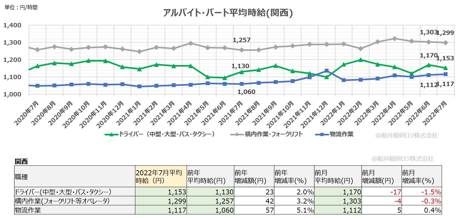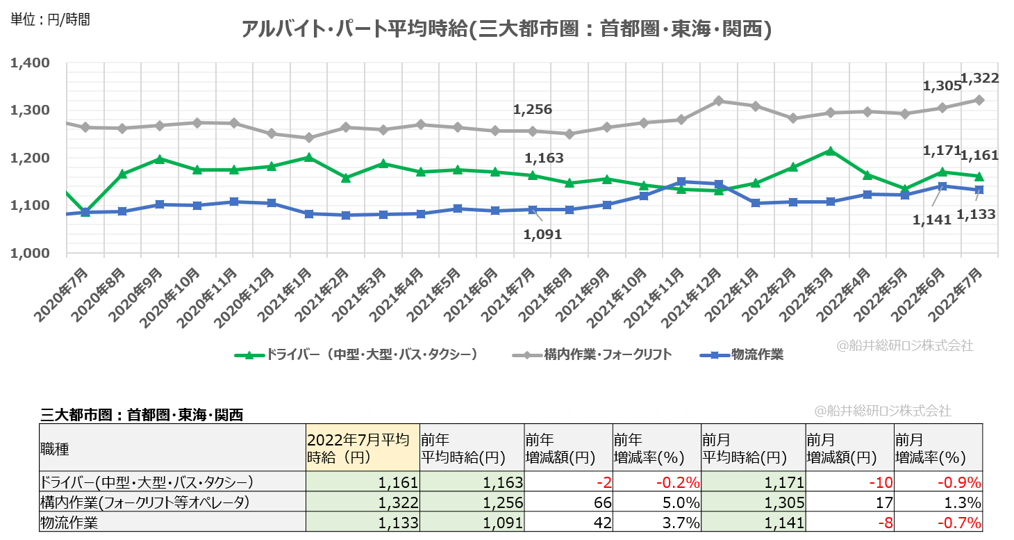 物流関連のアルバイト・パート賃金時給調査データ 2022年7月