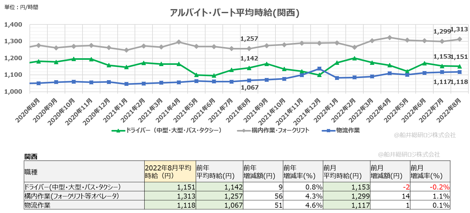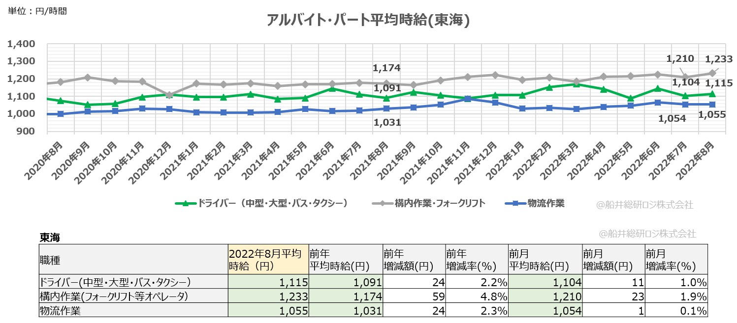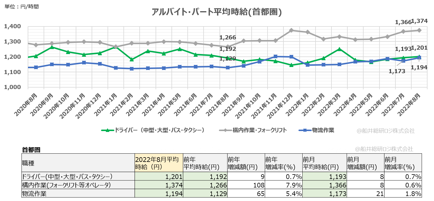 物流関連のアルバイト・パート賃金時給調査データ 2022年8月
