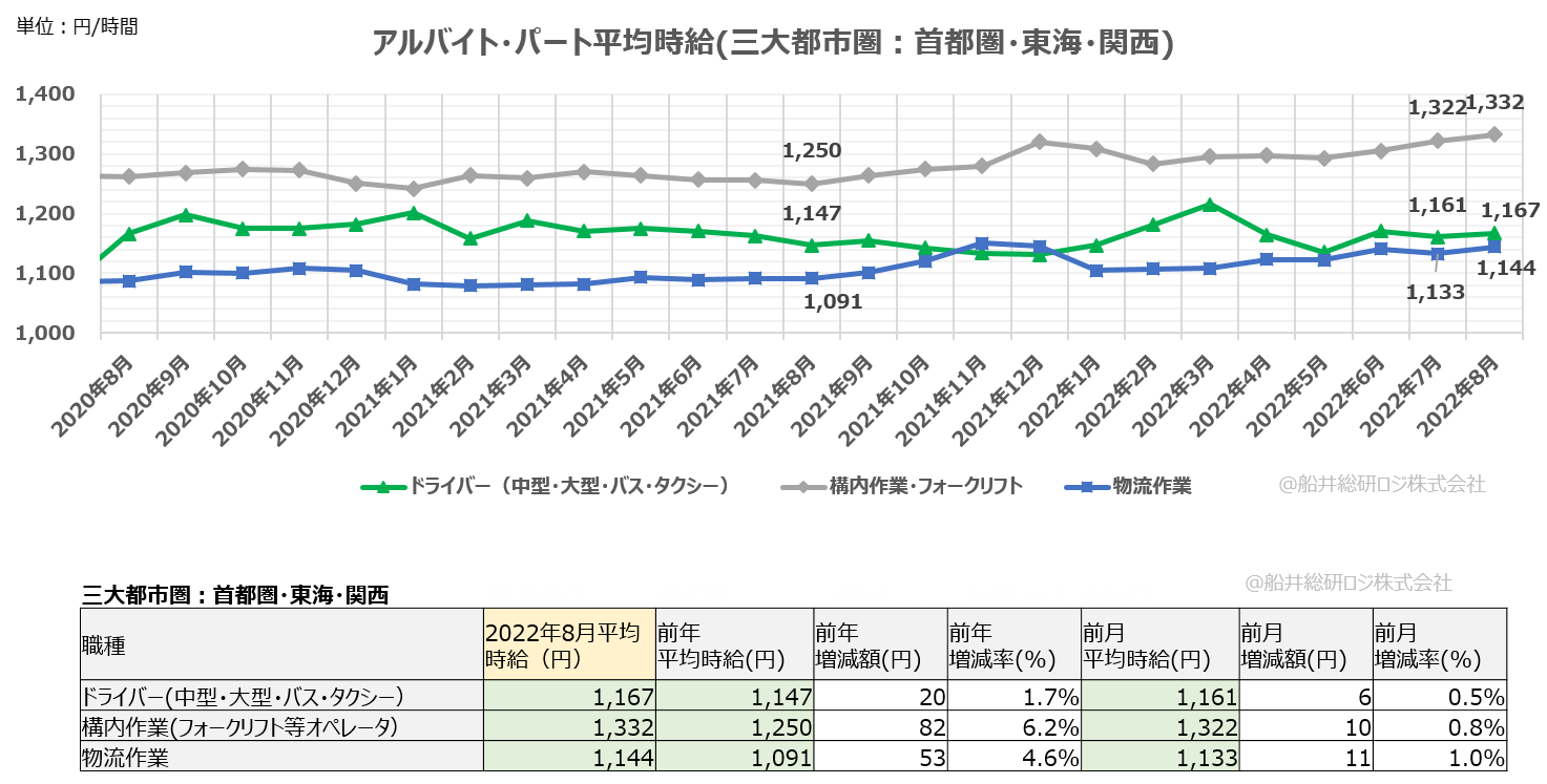 ・2022年8月は、三大首都圏全体における前月数値と比較すると、ドライバーの平均時給が前月比0.5%増、物流作業の平均時給が前月比1.0%増であった