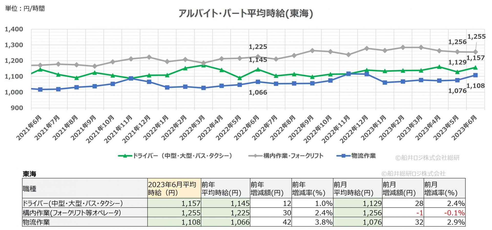 ・三大都市圏のドライバーの平均時給は下落しているものの、東海では2.4%増加している