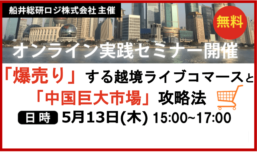 船井総研ロジでは、最大の越境EC市場である中国への「爆売り」をメインテーマに、社会インフラとなってきたライブコマースと中国への越境ECのビジネスモデル参入のためのセミナーを企画しております。日本国内で大きな売上アップが見込めない企業にとって、お隣の巨大市場であり、EC大国である中国市場はまさに絶好の市場として完成しております。すでに中国向けの越境ビジネスを実施されている企業はもちろんのこと、これから中国むけ販売を検討される企業もぜひこの機会にご参加くださいませ。
