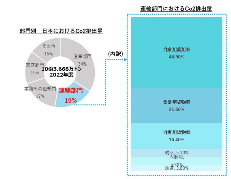日本国内のCO2排出量(10億3,700万トン)のうち、運輸部門からの排出量は約10~20%を占めています。特にトラック輸送の排出量は、その内の9割と大部分を占めており、業界全体での脱炭素化が急務となっています(資料①)。