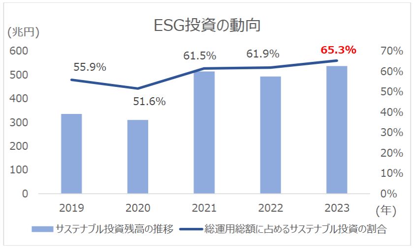 NPO法⼈⽇本サステナブル投資フォーラム の「サステナブル投資残⾼調査」 では、2023年において総運用総額に占めるサステナブル(ESG)投資の割合は65.3%を占めています。
