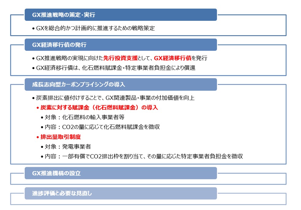 まず、GX推進法とはどのような内容なのでしょうか。この法案で特にポイントとなるのは、「GX経済移行債」と「成長志向型カーボンプライシングの導入」であり、それぞれの内容は以下の通りとなっています。