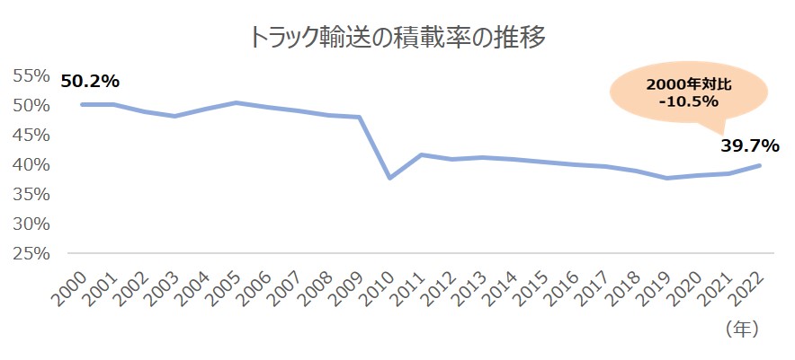 国土交通省が公表している「自動車輸送統計調査」より積載率を算出すると、2022年の積載率は39.7%となっており、2000年と比較すると、22年間で約10.5%低下していることがわかります。