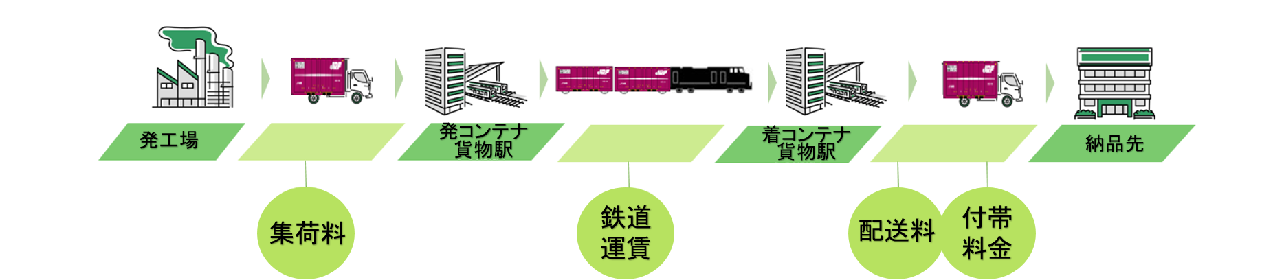 コンテナ貨物駅から納品先までをトラックにて配送するような鉄道とトラックを組み合わせた複合一貫輸送となります。(図表1) 鉄道輸送の運賃に関しては、集荷料(集荷、取扱に関わる料金)、鉄道運賃、配送料(配達、取取扱に関わる料金)、附帯料金(待機料、余剰資材など)が含まれます。トータル運賃に関しては発の運送会社が請求権を保有しています。