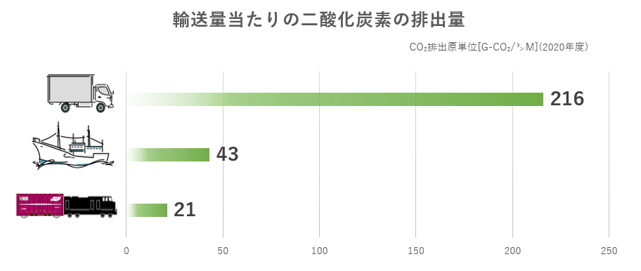 モーダルシフトとは、主にトラックで行われている輸送から、環境負荷の少ない(Co2排出量が少ない)鉄道や船舶などの輸送手段に切り替えることを指します。トラックで直接目的地まで運ぶのではなく、拠点間で輸送モードを鉄道や船舶に切り替えて輸送を行います。
