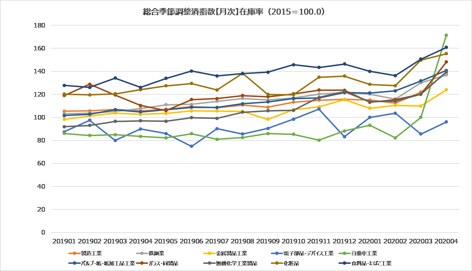実際に、モノの動きは鈍くなっており、総務省統計局が発表している「鉱工業生産・出荷・在庫指数」のデータから各業種(製造工業、鉄鋼業、金属製品工業、電子部品・デバイス工業、自動車工業、パルプ・紙・紙加工品工業、ガラス・同製品、無機化学工業製品、化粧品、食料品・たばこ工業)を見てみると2020年4月の在庫率(2015年=100.0とした場合)は、一部の業種を除いて全体的には2020年1月から徐々に増加していることが読み取れるかと思います。