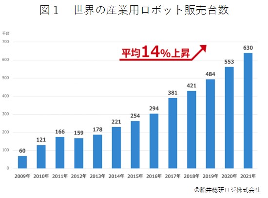 産業用ロボットの世界販売台数を見ると、2012年は15万9000台ですが、2017年に38万1000台と倍増しており、2019年は48万4000台、2021年には63万台になると予測され、販売台数は年間14%上昇しています(図1)。