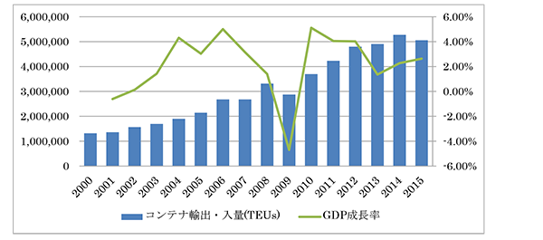 輸出入コンテナ物量(TEUs)とGDP成長率の推移