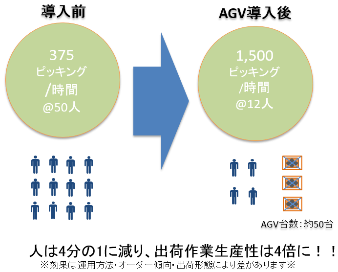 実際に物流ロボットの1つであるAGVを導入した際の効果を以下に記します。