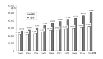 通信販売の市場規模は2002年~2011年にかけて193%の拡大を示しており(図3)、2014年には10兆円を超えるとの予測があります。