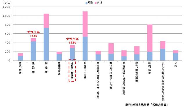 まず、物流業界において女性社員の就業者数はどのくらいいるのでしょうか。総務省が発表している「労働力調査」より、産業別男女の就業者比率を見ると、「建設業」(14.8%)に次いで、「運輸業・郵便業」(18.6%)は女性比率が低い産業となっております。