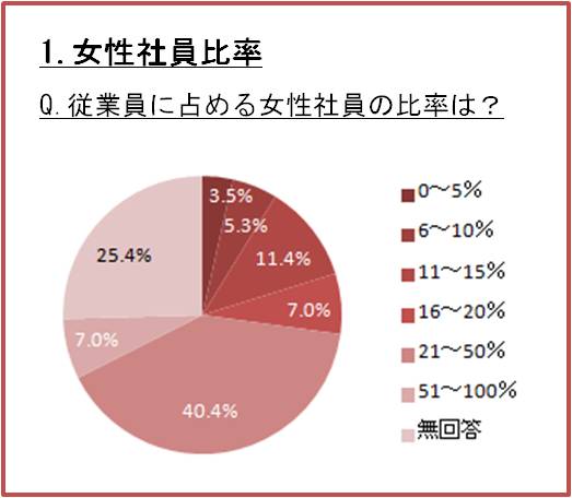 当社独自で物流企業の方々へ「物流企業における女性登用に関する調査」を実施しました(※1)。その調査においても、従業員に占める女性社員の比率が21~50%と答えた企業が最も多い結果(40.4%)となっております。(下記集計結果 1.女性社員比率 参照)しかし、従業員に占める女性社員の比率が50%超であると答えた方は、7.0%いました。それらの企業は、アパレル、日雑品といった商材に特化した物流業務を行っている物流企業でした。取扱商材(一般消費者に身近なものであるかどうか)や荷姿(重量物ではなく、手で持ち運べるサイズおよび重量)は従業員における男女比率を左右する要因の一つでもあります。