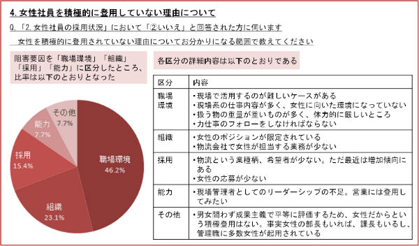 次に女性社員を「積極的に登用していない」と答えた物流企業において、その理由を調査しましたところ、以下の回答となりました。(下記グラフ 4.女性社員を積極的に登用していない理由について 参照)