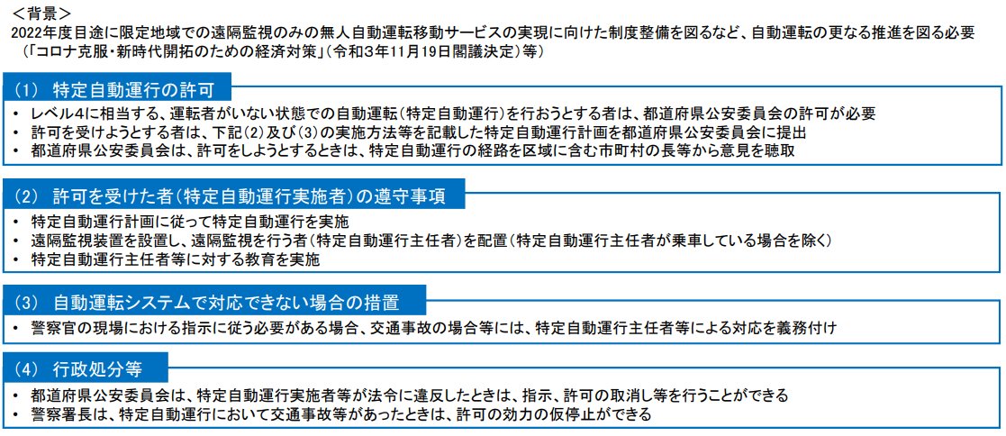 「特定自動運行」とは、自動運転の基準が「レベル4」に相当する運転者がいない状態で遠隔監視のみの自動運転のことを指します。この「特定自動運行」の許可制度が規定されました。これにより、「レベル4」の自動運転移動サービスを行う者は、特定自動運行計画を策定し、都道府県公安委員会に申請・審査を受けることでサービスを提供することが可能となりました。