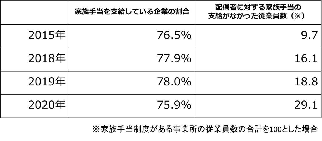 人事院が公表している『民間給与の実態/令和2年職種別民間給与実態調査』によると、75.9%の企業が家族手当制度を導入しています。また、家族手当制度がある事業所の従業員数の合計を100とした場合、29.1が配偶者に対する家族手当を支給していないようです。
