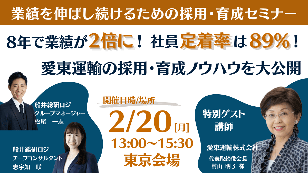 8年で業績2倍・ドライバー採用の成功・社員定着率89%と全てにおいて高い水準を維持する愛東運輸様を特別ゲスト講師としてお招きします!業績を伸ばし続けるための採用・育成手法を追求し、圧倒的な応募数と高い定着率を実現させましょう。