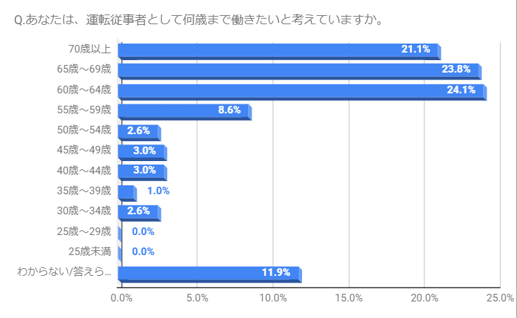 スマートスキャン株式会社『スマート脳ドック』調べでは、「あなたは、運転従事者として何歳まで働きたいと考えていますか。」という問いに対して、現役運転従事者の7割以上が「60歳以上でも働きたい」と回答をしました。