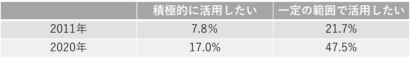 また、マイナビ社の「就職活動において実名を伴ったソーシャルメディア・SNSをどの程度、活用したいですか」というアンケート調査では「SNSを活用したい」と答えた求職者が10年間で3倍以上に増加しています。