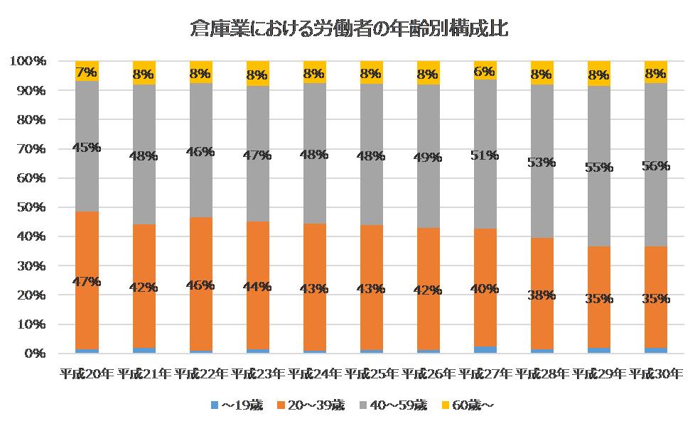 また、厚生労働省が発表している「賃金構造基本統計調査」から倉庫業における労働者の年齢別の構成比を算出して見てみると平成20年~平成30年にかけて39歳以下は減少しているのに対して40歳以上の労働者が増加していることが読み取れます。