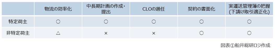 改正内容より特定荷主の義務付け事項及び非特定荷主の努力義務事項を下図に〇:義務、△:努力義務、×:対象外で整理しました(図表①)。義務内容の詳細について本稿では触れませんが、主な項目は下図の通りです。