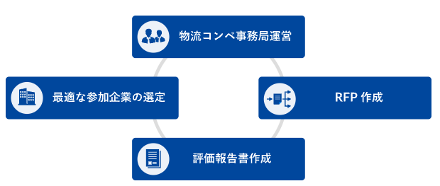 貴社にとって最適な物流パートナーを選定するあらゆるプロセスに対して、必要なノウハウや多種業界・多数企業の物流委託先選定(コンペ)経験を活かし、合理的な手順で包括的に支援します。