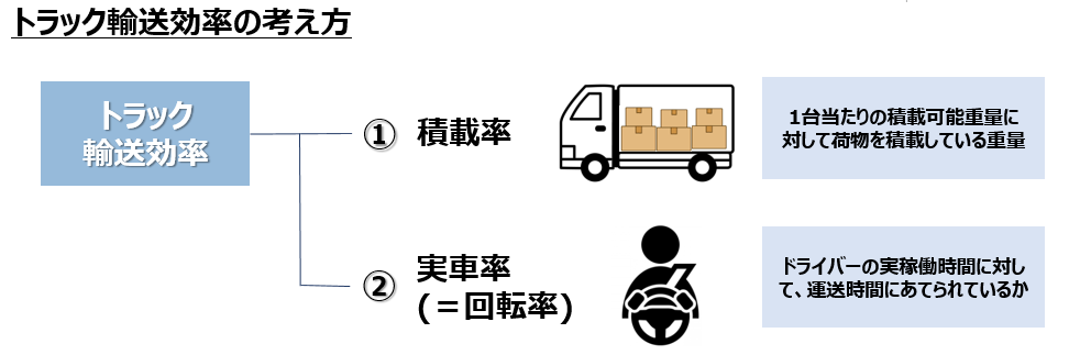 日本では下請け運送業者の売上減や品質低下等の多重下請けによるリスクを把握しつつも、トラックドライバーに対して契約外の荷役・付帯作業や荷待ち時間の発生等、時間に係る要素に対し、正当な対価が支払われていないのが実態です。これは輸送効率低下にも大きく影響しています。トラック輸送効率とはトラック1台当たりの積載効率と時間当たりの実車率によって決まります。(図表3)