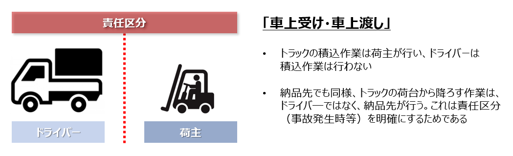 現在、米国ではトラック輸送の大半を占めるトレーラー輸送において、ドライバーの荷待ち時間はほとんど発生していません。また、委託先のドライバーが契約外の荷役作業中に、万が一事故が発生した場合は、荷主側が損害賠償請求を受けることになる為、「車上請け・車上渡し」の原則が厳格に順守されており、荷主側がドライバーに契約外の荷役を依頼することは基本的にありません。(図表2)
