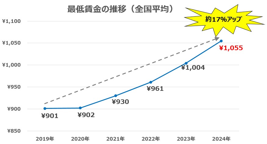 図1の推移を見ると、2019年~2020年はコロナ禍の影響もあり、最低賃金に大きな変動はありませんでした。しかし2021年以降は右肩あがりに上昇し、2024年においては、前年比5.1%アップ、2019年対比では、約17%も時給単価が上昇していることになります。