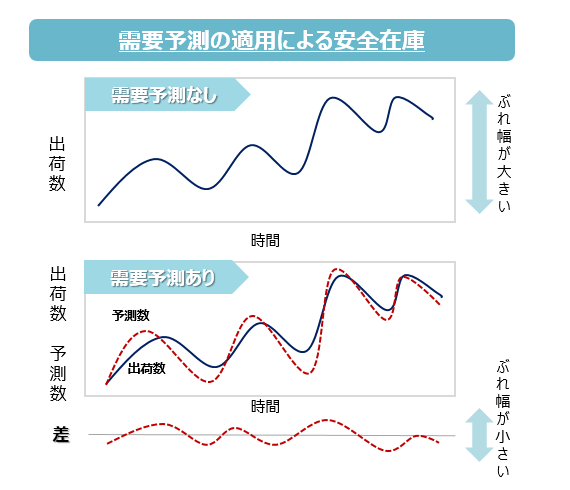 需要予測は今後想定される需要を過去の販売実績や各種経済指標等を用いて予測することです。需要に変動があると、欠品を防止する為に多くの安全在庫を保有する必要がありますが、需要予測を行うことで、変動幅を出荷数と予測数の差に小さくすることができ、結果として安全在庫を減らすことが可能です。(図表3)