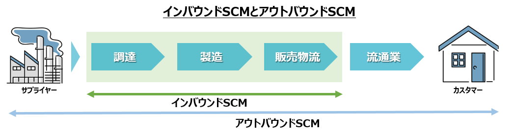 特に製造業では関税制度の変更や目まぐるしく変化する新興国マーケットに迅速に対応し、サプライヤーから最終目的地であるカスタマーに繋がる一連のサプライチェーンを最適化するため、SCM(サプライチェーンマネージメント)計画系システムの効率的な活用を検討する必要があります。その一方で、多くの企業では規模の小さい範囲で自社を中心とした調達、生産、販売を対象としたインバウンドSCMの効率化が急務です。(図表1)