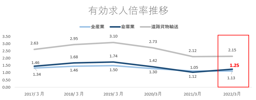 物流業界の人手不足にはドライバー不足が大きく提示されることが多いですが、今回はドライバーではなく、倉庫作業の求人倍率に注目します。2022年3月において1.25とドライバーと比較すると低いが、全産業と比較すると1.1倍ほど高い数値となっています。