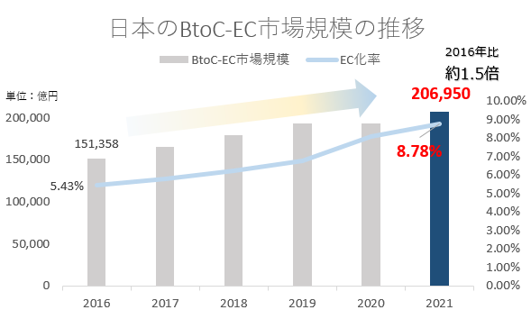 毎年EC市場は拡大しており、2021年には20兆6,950億円の規模にまで到達し、EC市場規模は5年前(2016年)と比較する1.5倍ほど高い数値を記録しました。ECが拡大すれば当然物流センターで入出荷作業御を行う労働力も必要となります。
