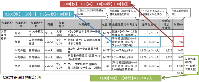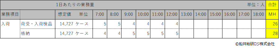 上記例では入荷・入庫作業工程で算出した9名が「荷受・入荷検品」で26【MH】、「格納」で28【MH】の工数であると算出しています。