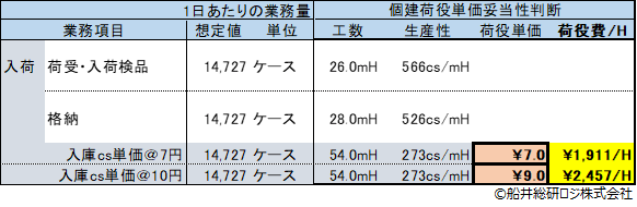 上表では入荷荷役個建単価が@7円/csと@10円/csの場合をそれぞれ算出すると、