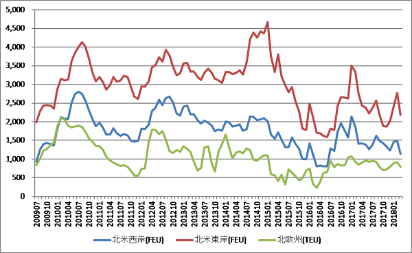 但し閑散期に突入し荷動きは鈍化、足元の短期市況も下落基調であり、特に競合が激しい北米西岸(ロサンゼルス)向けの交渉は日本市場でも一転する可能性があります。