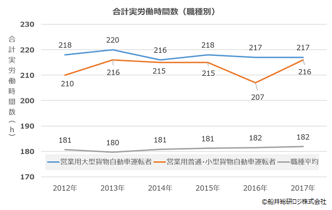 厚生労働省が発表している【賃金構造基本統計調査】の「所定内実労働時間数」と「超過実労働時間数」の合計実労働時間数を算出するとトラックドライバーは職種平均(※賃金構想基本統計調査に掲載されている各職種の合計実労働時間数の平均値)よりも約30時間多いことが見て取れます。