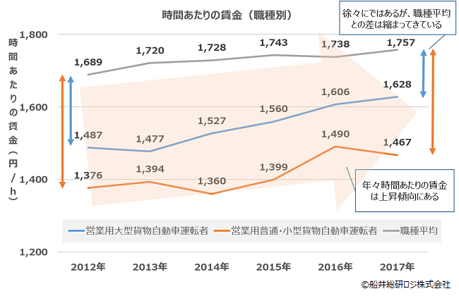 2017年の時点で営業用大型貨物自動車運転者は1,628円/h、営業用普通・小 型貨物自動車運転者は1,467円/h、職種平均(※賃金構想基本統計調査に掲載されている職種の時間あたりの平均値を引用しています)は1,757円/hであることが読み取れます。