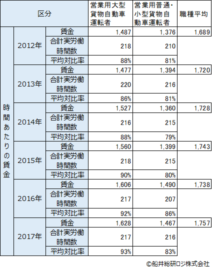 2017年時点でも営業用大型貨物自動車運転者は各職種平均と比較して、93%、営業用普通・小型貨物自動車運転者は83%であるため、約7~17%の乖離が生じていることが窺えます。