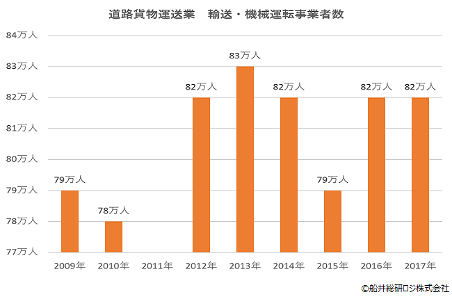 以下は総務省統計局が公表している、トラックドライバーを含めた「輸送・機械運転事業者数」のグラフになります。