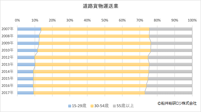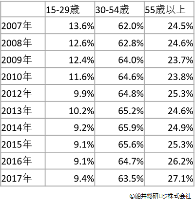 29歳以下の構成比率が減少し、2014年以降10%以下で推移しています。