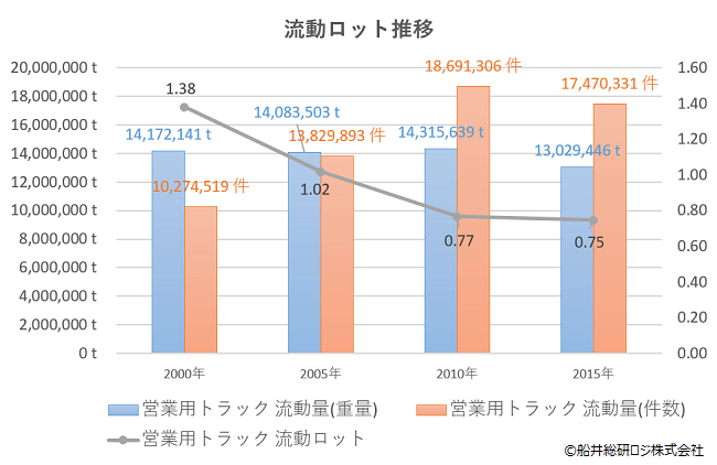 流動重量に大きな変化は見られませんが、流動件数が上昇傾向にあり、1件当たりの重量(流動ロット)が減少していることがわかります。